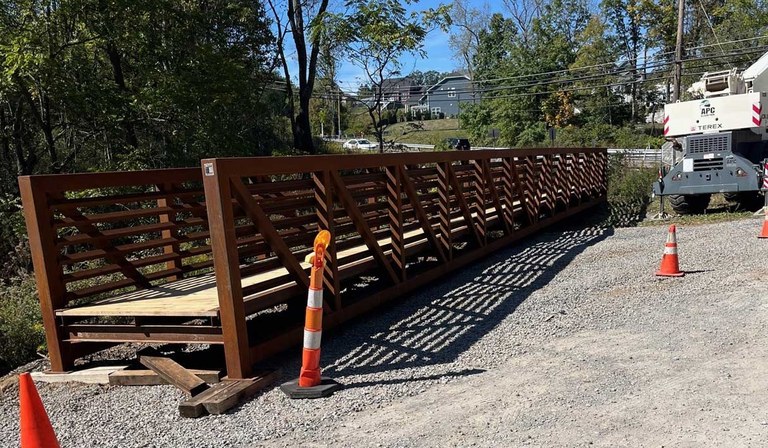 If you drive by the Harmony Trail parking lot on Route 910 you will probably notice a fully formed metal bridge sitting where cars would park. Accompanying it is a medium sized crane. It has been there for weeks and will potentially remain until spring. It is a stark reminder of how difficult it is to extend hiking corridors across major roads in our crowded county.